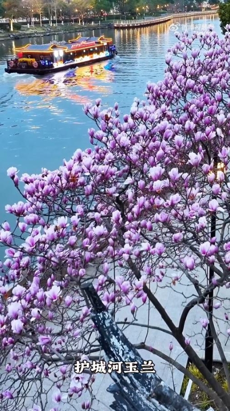 护城河两岸,玉兰低垂轻抚碧波。游船缓缓穿行,船头推散水面落花,舟过处涟漪揉碎一河花影,岸上人隔水望去,恍若船在画中游。