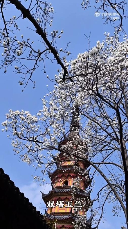 定慧寺巷深处,双塔景区内白玉兰与宋代砖塔静默对望。春风拂过,花瓣缀上青灰塔檐,花枝从塔身间隙斜逸,素白映古拙,定格成“花开塔寂寂”的禅意长卷。