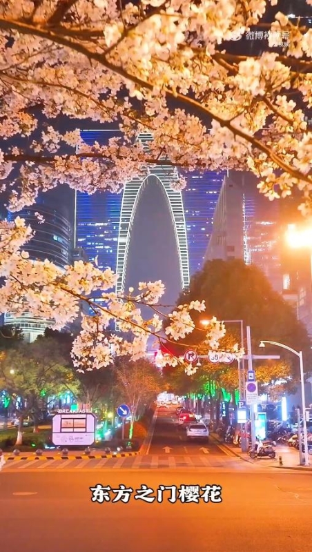 东方之门前的樱花多了几分现代的浪漫,古老与现代在花影中完美交融。