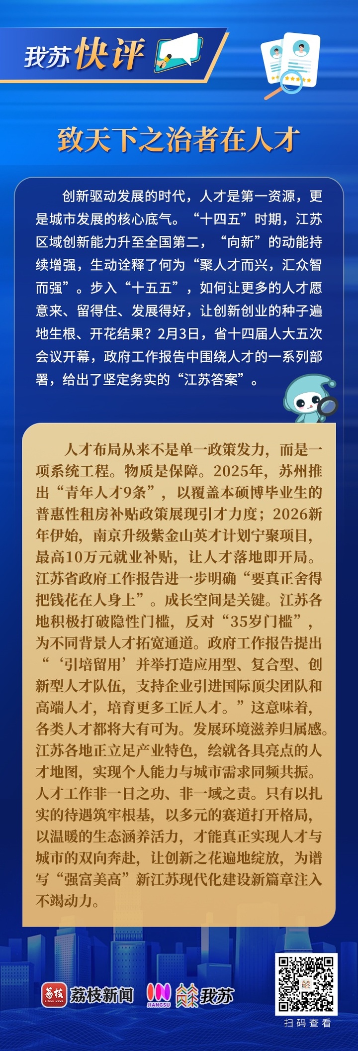 创新驱动发展的时代,人才是第一资源,更是城市发展的底气。“十四五”时期,江苏区域创新能力升至全国第二,“向新”的动能持续增强,生动诠释了何为“聚人才而兴,汇众智而强”。步入“十五五”,如何让更多的人才愿意来、留得住、发展得好,让创新创业的种子遍地生根、开花结果?2月3日,省十四届人大五次会议开幕,政府工作报告中围绕人才的一系列部署,给出了坚定务实的“江苏答案”。
