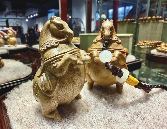 说话间,他又变戏法似的拿出一只木雕唐马,“看,今年是马年,可以做摆件,又可以做挂件。”