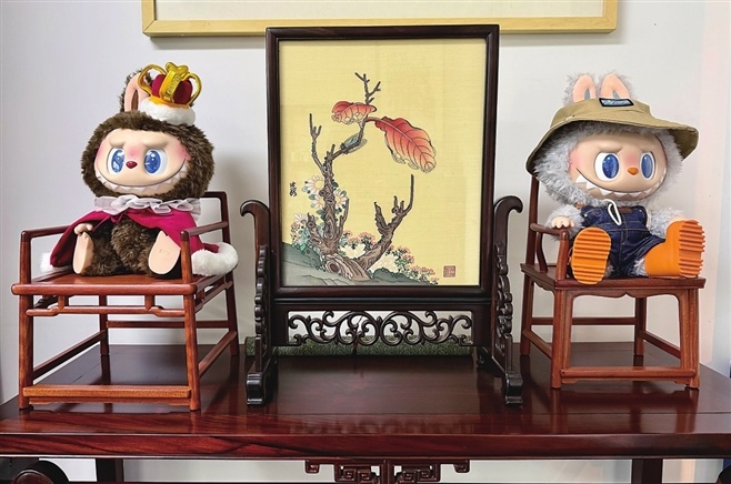 他靠着一张文椅侃侃而谈,背后几张微缩的明式椅摆件上,竟坐着几只潮玩Labubu。这混搭的一幕,直叫人称奇:哦,红木还能这么玩?