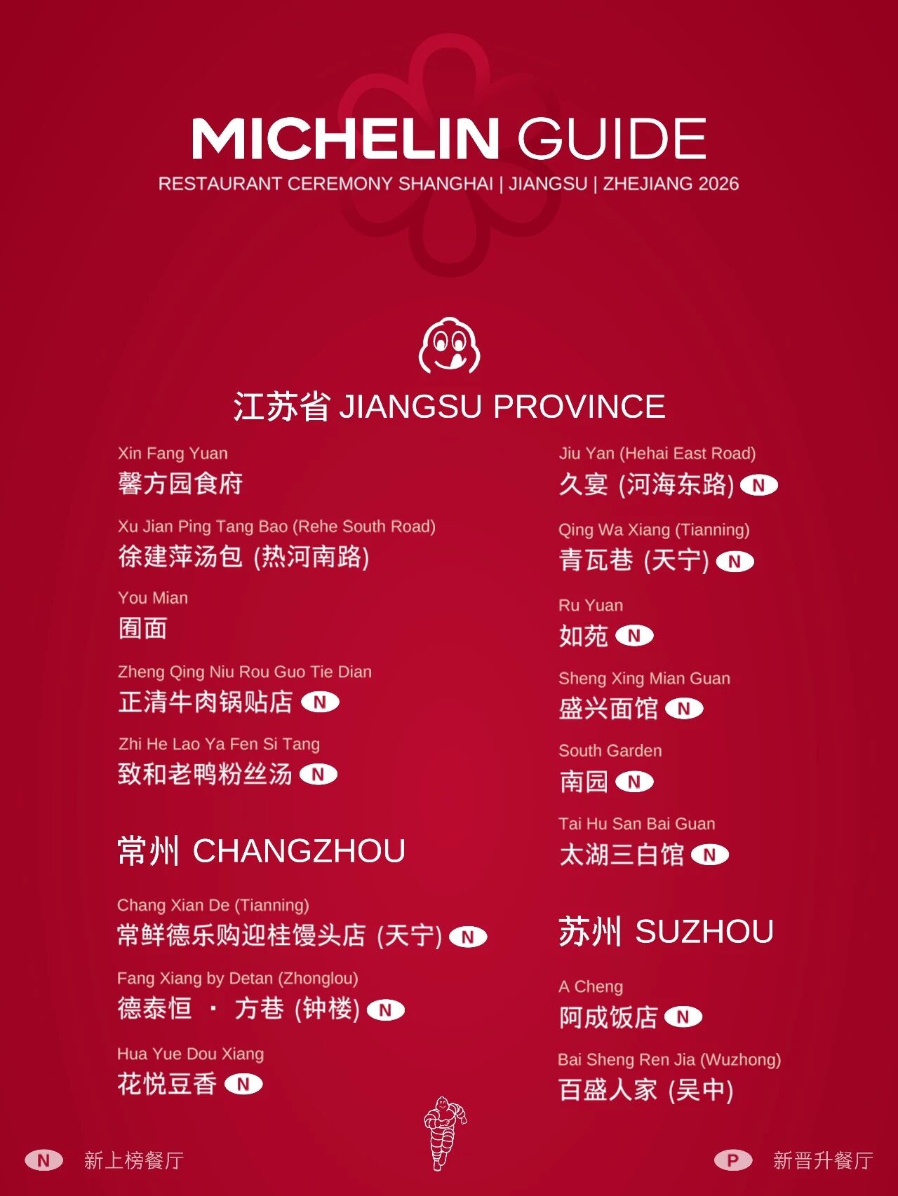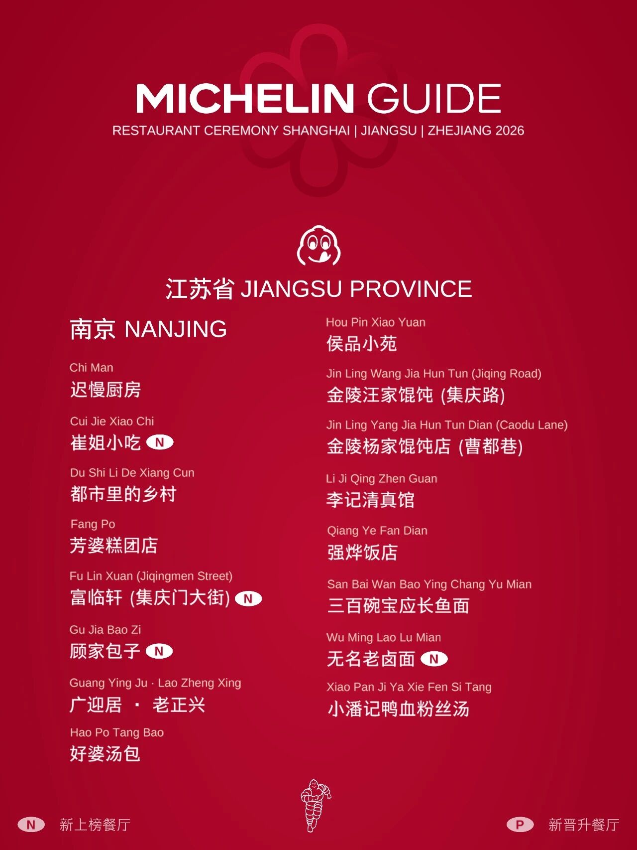 本次米其林指南餐厅榜单首次将上海、江苏省、浙江省三地合并发布,并新增江苏常州、浙江温州和台州3个全新美食目的地。本次榜单共收录409家餐厅,其中,江苏省111家。南京上榜的41家餐厅中,米其林一星餐厅4家,新入选2家;米其林指南入选餐厅16家,新入选5家;米其林必比登餐厅21家,新入选6家。