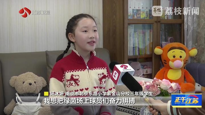 南京市北京东路小学紫金山分校三年级学生杨沐妍说:“当时我太兴奋了!我平时就喜欢画画,我想把绿茵场上球员们奋力拼搏、团结合作的样子画下来,还有看台上挥舞旗帜、热情欢呼的球迷们。我想用画笔展现足球的活力与魅力,让更多人感受到足球的快乐与力量!我的画能飞上太空,我特别开心、特别自豪,今年我会继续记录‘苏超’的精彩瞬间!”