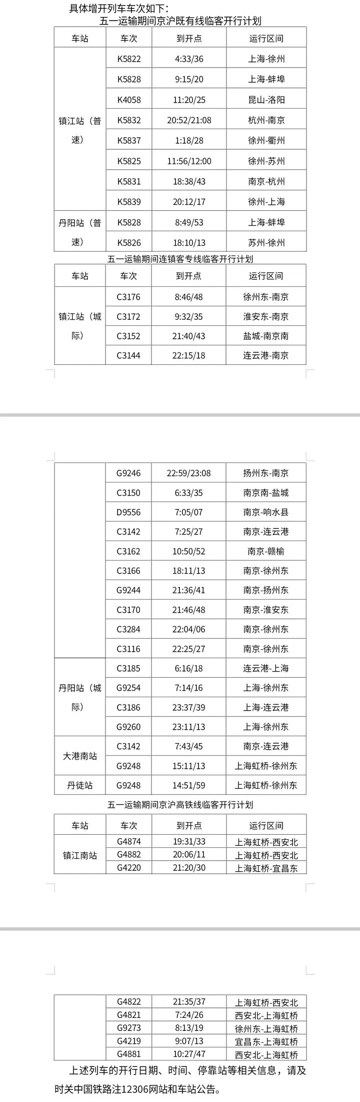 “五一”期间,为应对客流高峰,满足旅客出行需求,实现旅客平安、有序、温馨出行目标,铁路镇江站除按照高峰期列车运行图开足各趟图定旅客列车外,管内各站共增开临客列车39列,其中镇江站将增开普速列车8列,前往蚌埠、徐州、洛阳、上海、杭州方向;增开动车组列车14列,前往南京、徐州、连云港、扬州、淮安等方向。丹阳站增开普速列车2列,前往蚌埠、徐州方向;增开动车组列车4列,前往上海、徐州、连云港等方向。镇江南站增开高铁列车8列,前往西安、宜昌、上海等方向。大港南站增开动车组列车2列,前往连云港、徐州方向。丹徒站增开1列动车组往徐州方向。