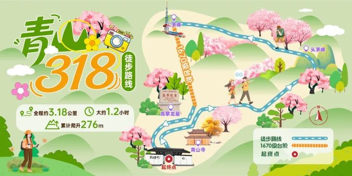 作为重磅环节,一条长度为3.18公里的「青山318」徒步线路正式发布。该路线从青山公园大草坪出发,串联恋山亭、二茅峰电视塔、著名的1670级台阶等景观,累计爬升约276米,旨在为市民提供一个强度适中、风光旖旎的城中山野徒步新选择。许多参与者随后便身着统一服装,踏上这条新路线,用脚步丈量春光。