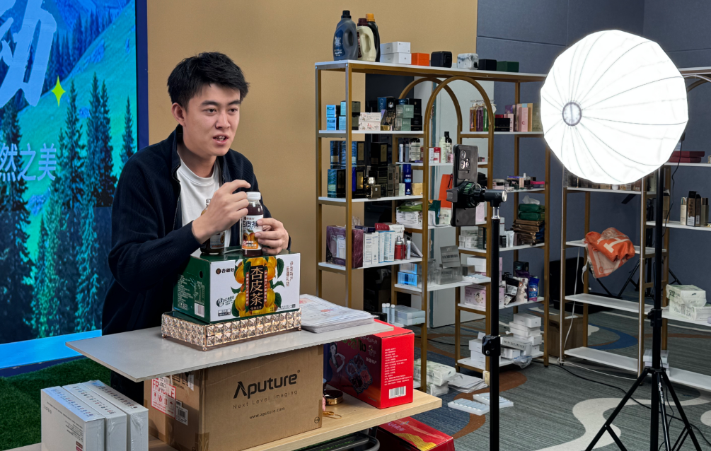 伊宁县青创园里,主播在南通援建的直播间为当地农产品带货