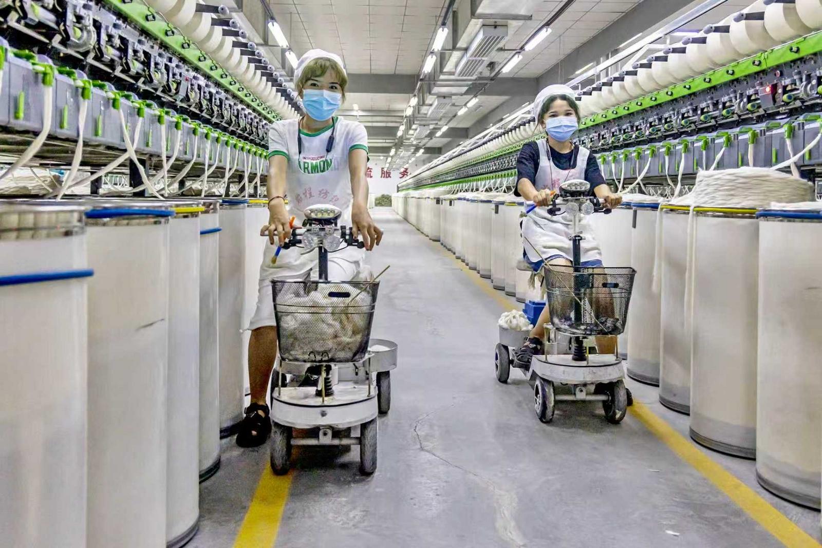 伊宁县纺织产业园内,工人骑着巡检车,保障生产高效运转。