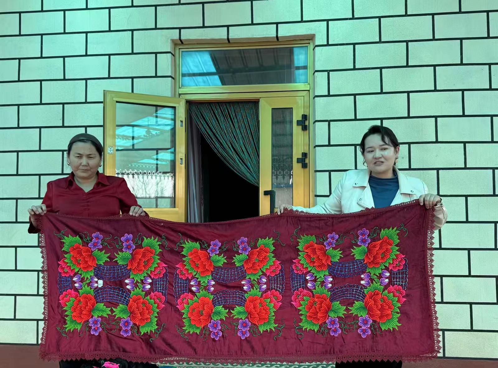 阿娜尔汗(左一)展示自己制作的手工艺品